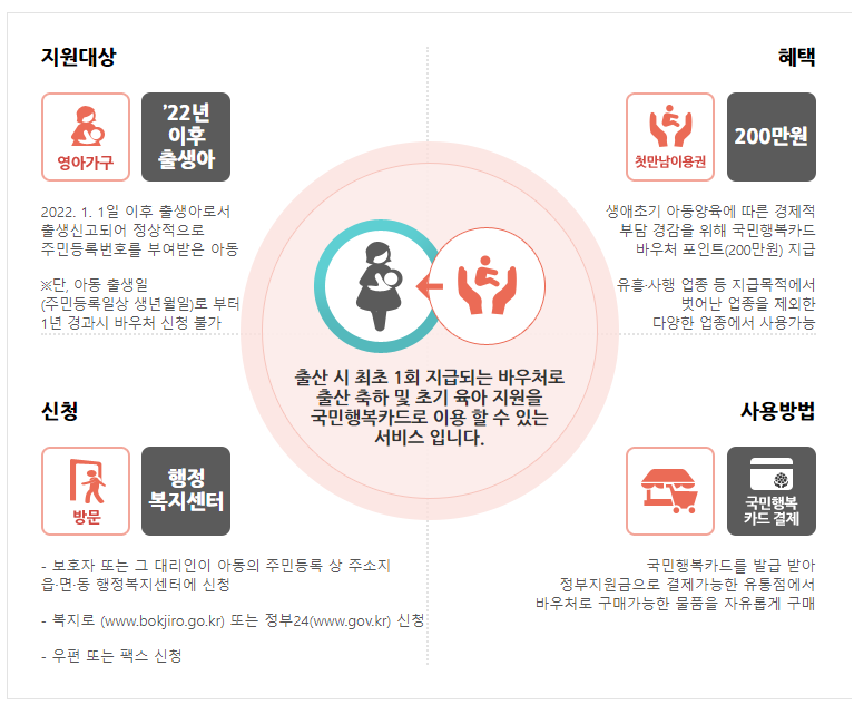 2022년 출생아부터 200만원의 바우처가 지급됩니다. 국민행복카드로 지급되며, 출생 초기 양육부담경감을 위해 2022년 신설되었습니다. 출생일로부터 1년간 사용이 가능합니다. (유흥, 사행, 레저업종 등을 제외한 전 업종에서 사용가능)